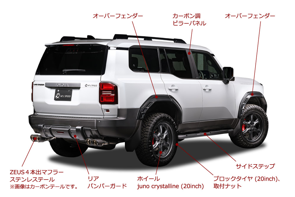 エアロバージョンと比較して下記装備がお得 AES製オーバーフェンダー ZEUS4本出しマフラー ステンレステール juno crystalline 20インチ 20インチブロックタイヤ(275/55-20)