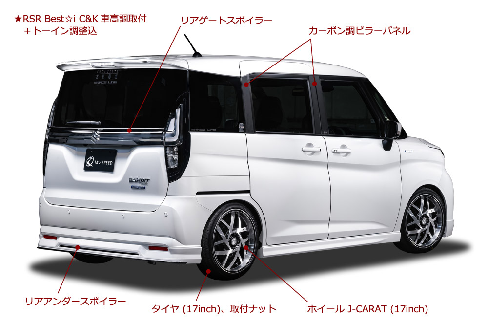 エアロバージョンと比較して下記装備がお得 ABS製フロントグリルガーニッシュ ピアノブラック AES製リアゲートスポイラー シボ加工艶消BK AES製カーボン調ピラーパネル RSR Best☆i C&K車高調 J-CARAT 17インチ